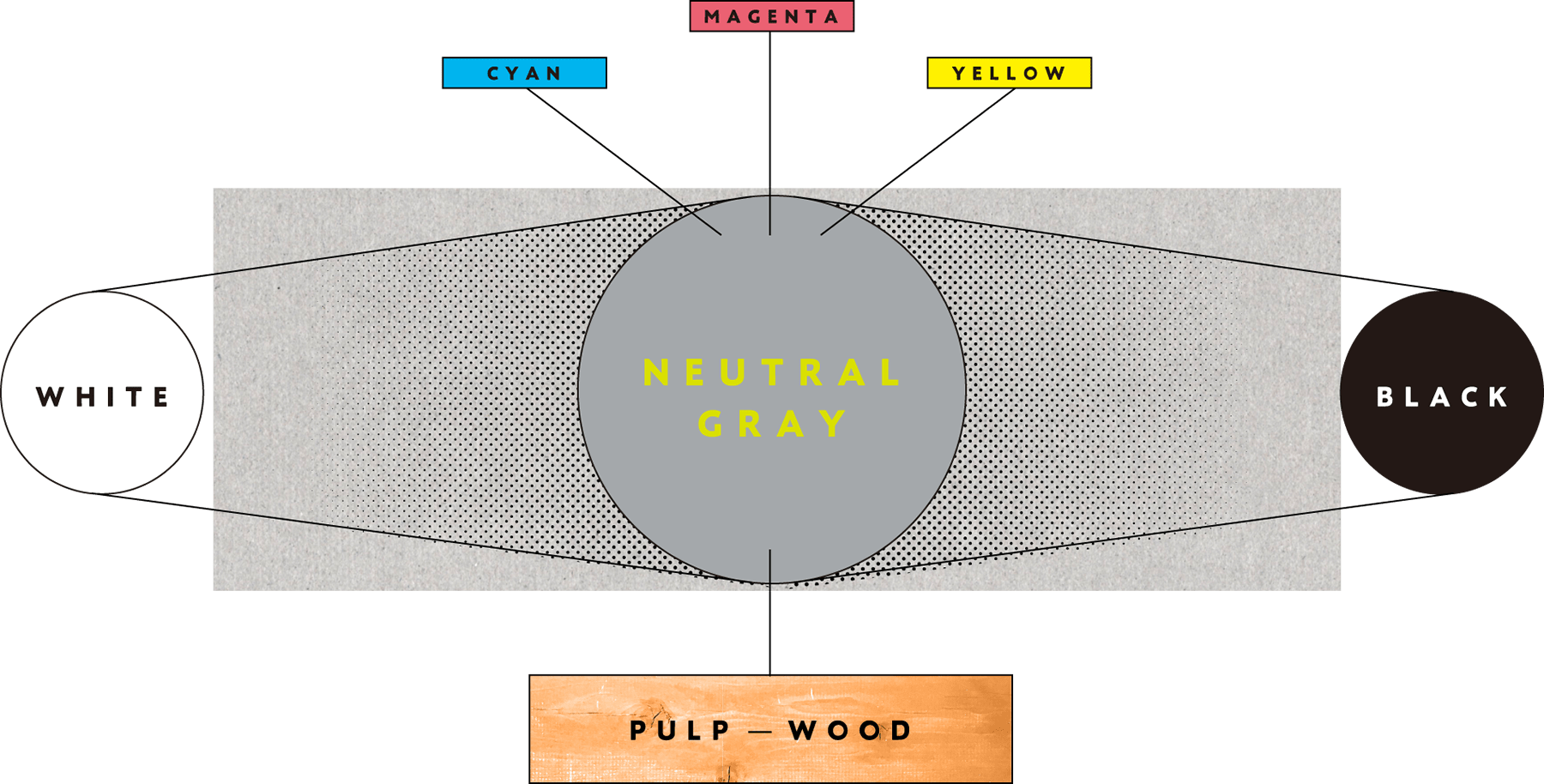 Y(イエロー)、M(マゼンタ)、C(シアン)のインキが等量で刷り合わさった時に表現される「ニュートラルグレー」を中心に置き、