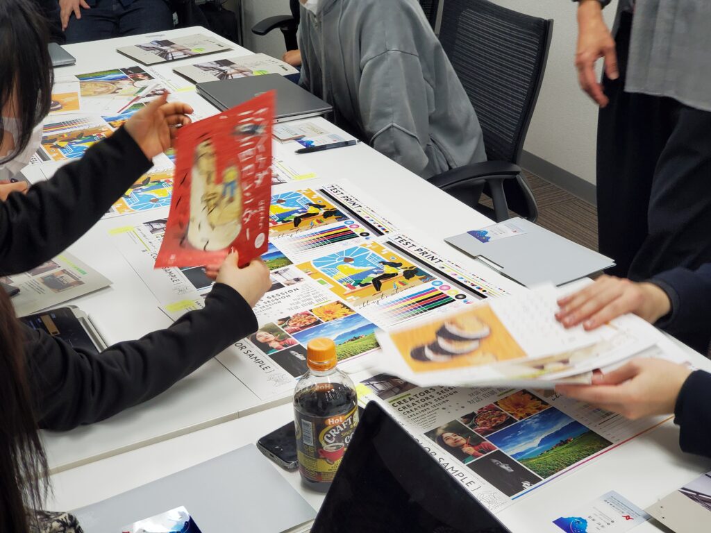 最初から参加してくださった方、仕事の段取りがついて途中から参加してくださった方々、入れ替わり立ち替わりで様々なスタッフの皆さんにご参加していただきました。中には印刷に詳しい方もいらっしゃり、様々な質問が飛び交い、今までのデジタル印刷ではできなかった事が可能になったことに驚かれたりと有意義な情報交換ができたと思います!開催へのご協力、本当にありがとうございました!!!