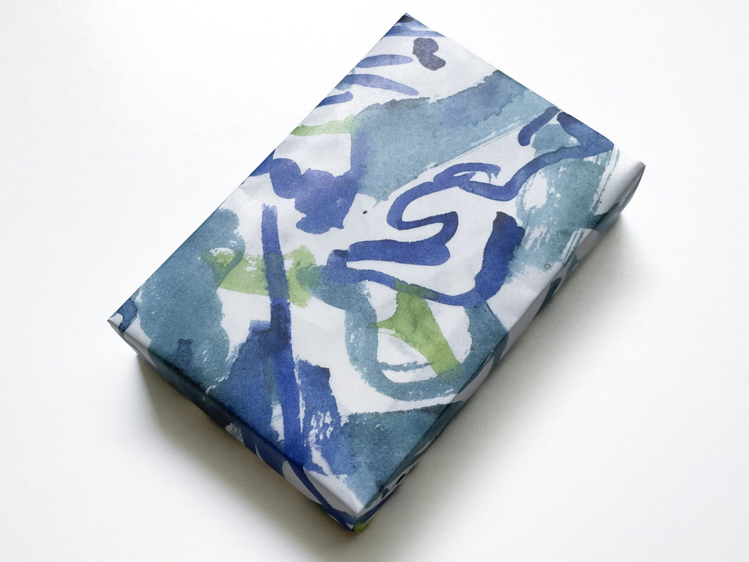 まず包装紙はご希望の片艶晒クラフト系とこちらからのご提案のものをご送付しました。その中からデジタルオフセットなら「OKブリザード 60kg」、UVオフセットなら純白ロール紙「白銀 38.5kg」に絞り込みました。まずは実際の商品をそれぞれの用紙で包んでいただき、その包みやすさを実験してもらったところ、薄手の白銀が包みやすいとのご意見をいただきましたので、UVオフセットで印刷することになりました(デジタルオフセットは薄い用紙が苦手のため)。