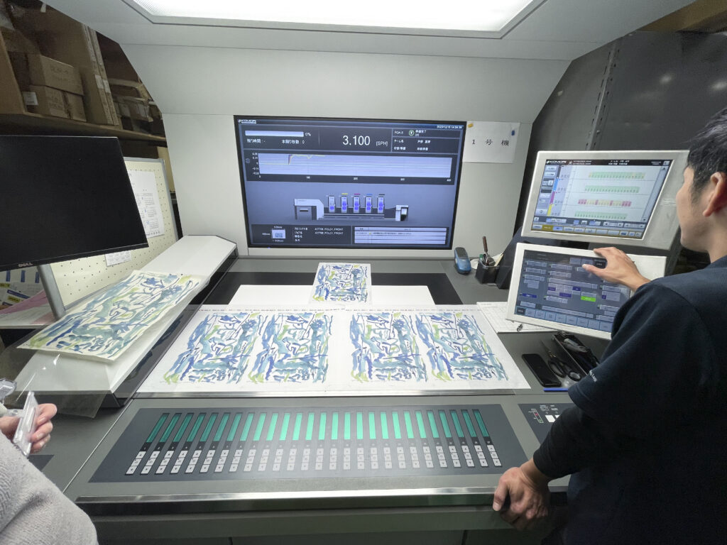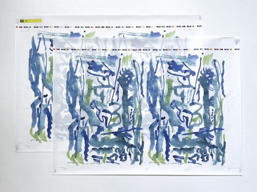 次は本機による本紙色校正です。まずは包装紙です。そのままの色味と少し濃く鮮やか目に印刷した2パターンを印刷しました。