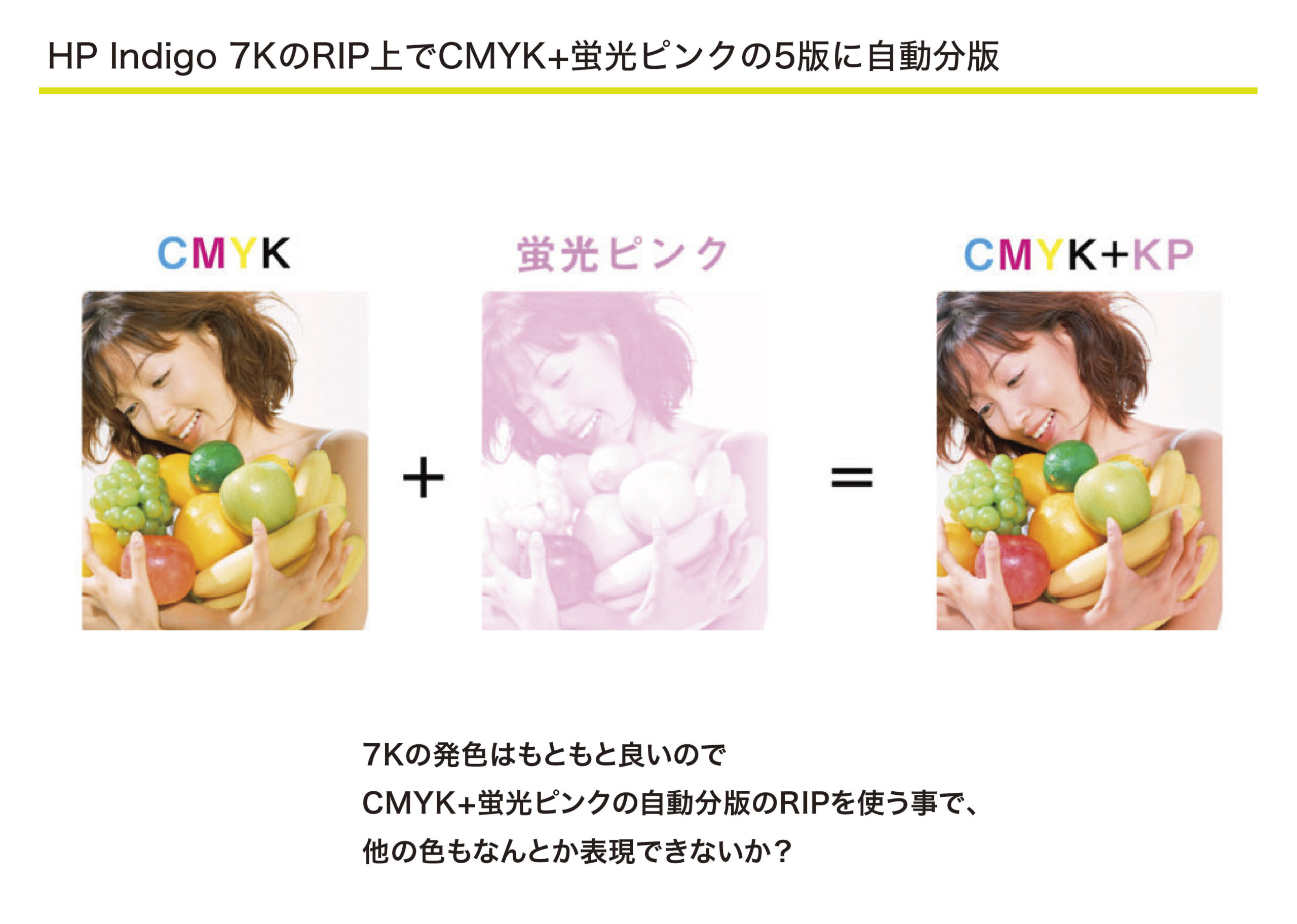最初にチャレンジした技術は、そのRGBデータを自動分版にかけてCMYK+蛍光ピンクの5色分版にして印刷をしてみました。