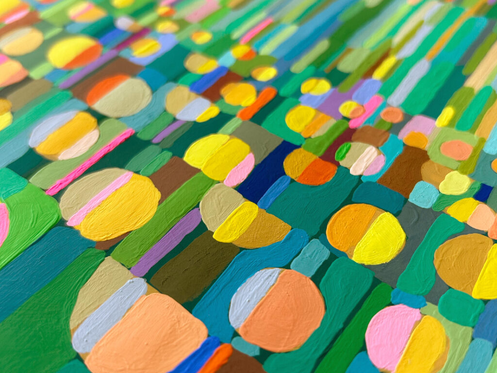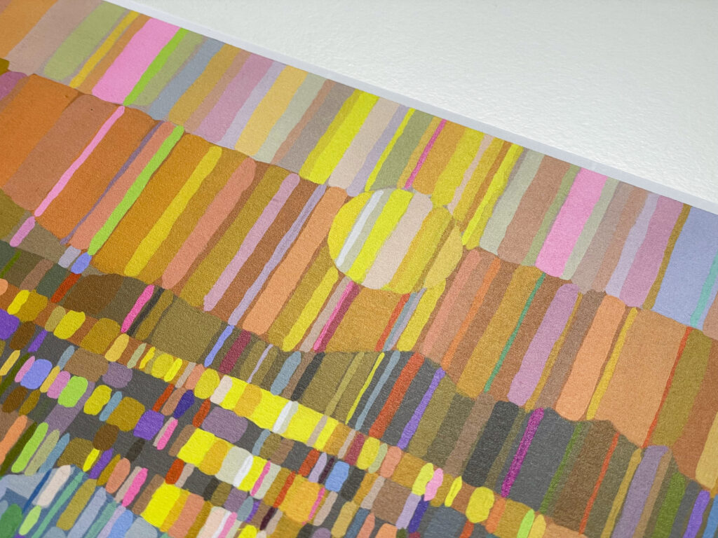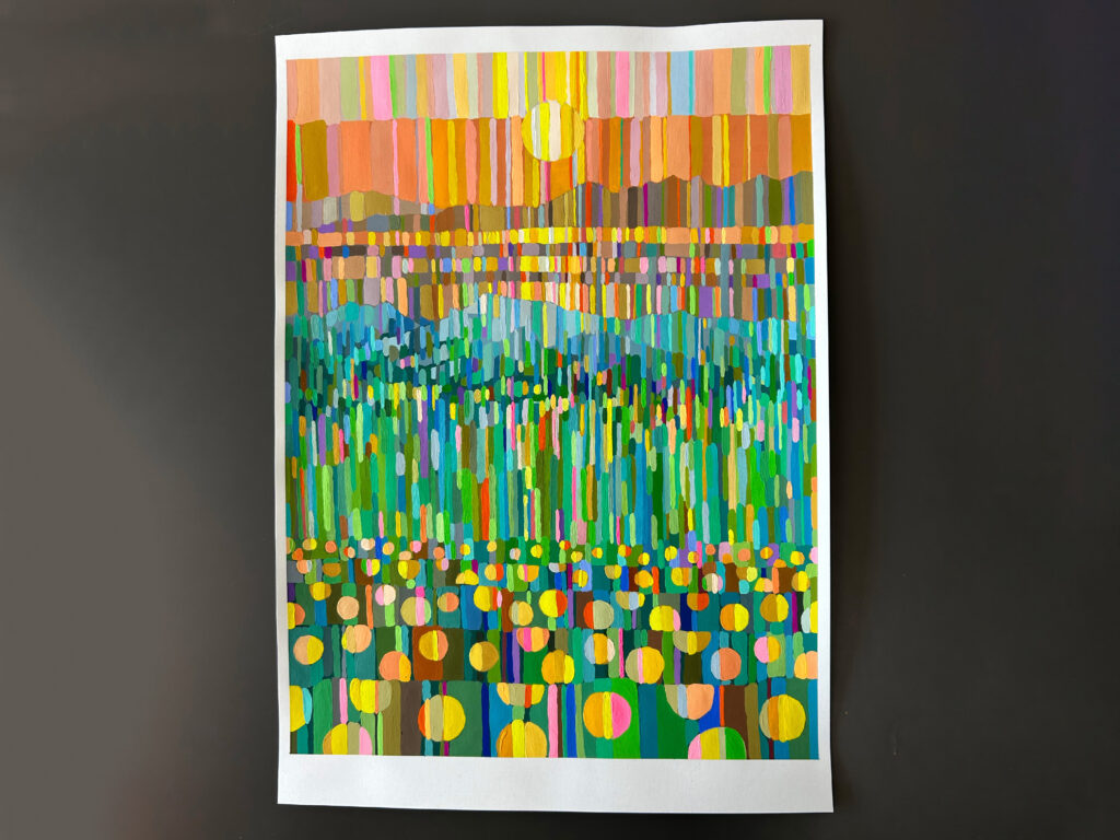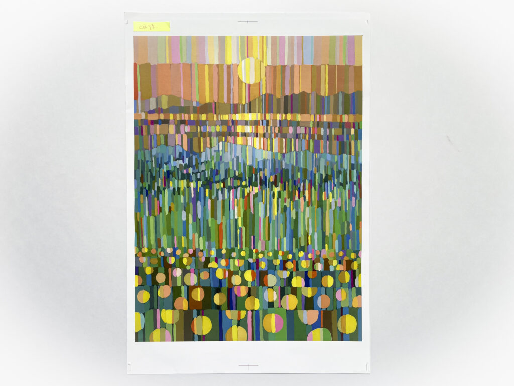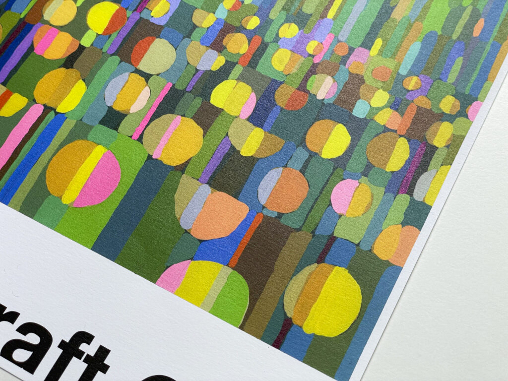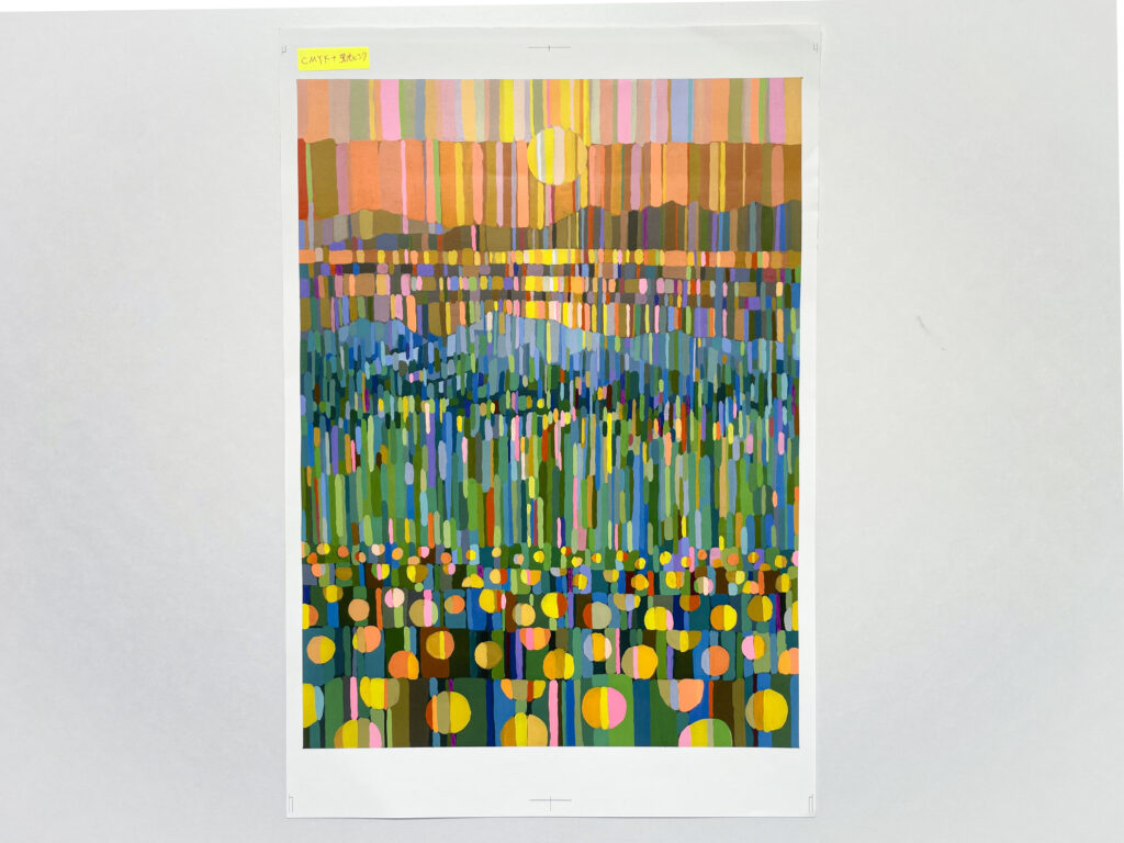 原画はアクリル絵の具で蛍光ピンクやかなり鮮やかなグリーンや黄色が使われている美しい作品でした。紙は画用紙のような素材感のある紙が良いとのことだったので、本来ならアラベールかマーメイドと思いましたが、今回は発色の良さがキモなのでヴァンヌーボVスノーホワイトささせていただきました。