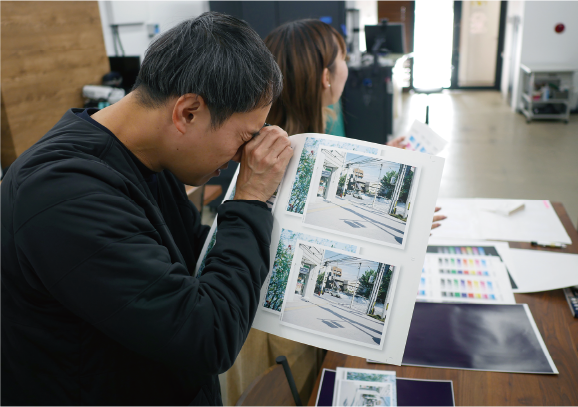 最新のデジタル印刷機を用いて、完全データの試し刷りができます。色校や紙・インキ選びのヒント、クライアントに提案する際の仕上がりイメージづくりなどに、ぜひご活用ください! 印刷立ち会いも歓迎です。